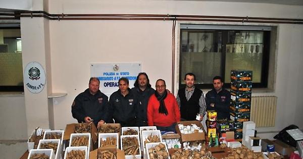 Gli agenti hanno trovato una carabina automatica calibro 22 marca Beretta completa di caricatore innestato rifornito con cinque cartucce, pronta all’uso, ed un calcio di fucile calibro 12; venivano rinvenute ulteriori duecento munizioni, una cinquantina aventi calibro 22, la rimanenza avente calibro 12. A casa di uno degli indagati sono stati recuperati oltre 200 chilogrammi di materiale esplodente, la maggioranza composto da micidiali fuochi pirotecnici artigianali illecitamente detenuti