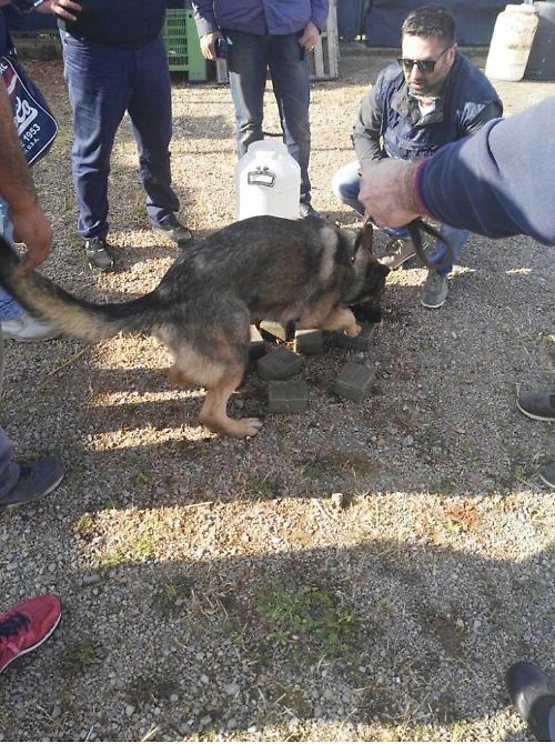 La successiva attività di ricerca, svolta grazie al prezioso ausilio di “UDOR”, il bellissimo pastore tedesco, messo a disposizione dalla Squadra Cinofili della Polizia di Frontiera di Brindisi, ha consentito di rinvenire altri bidoni abilmente nascosti, con all’interno altra sostanza stupefacente tipo marijuana. Inoltre, all’interno del locale deposito sono stati ritrovate alcune decine di pacchi confezionati con all’interno hashish. Complessivamente sono stati ritrovati più di trenta chilogrammi di droga, fra hashish diviso in panetti abilmente celati e marjuana. Lo stupefacente era pronto per essere messo sul mercato e avrebbe fruttato un centinaio di migliaia di euro.
