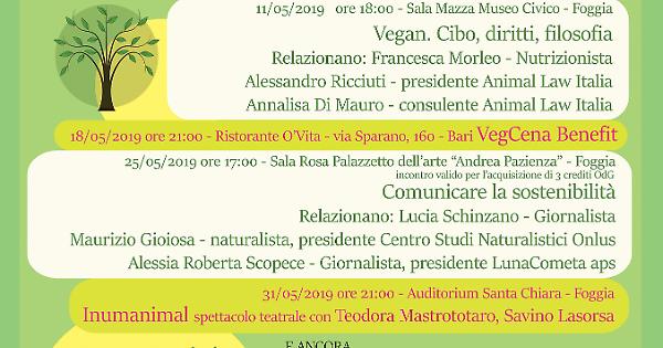 La seconda edizione di “Maggio senza crudeltà”, il festival dedicato al vivere sostenibile ed etico proposto dall'associazione di promozione sociale LunaCometa, è ormai alle porte. Diversi appuntamenti sono in programma lungo tutto il mese. Il 4 maggio si parte con un gazebo informativo presso l'isola pedonale, in occasione del quale si potranno ricevere informazioni sulle iniziative stesse ma anche sulle attività dell'associazione promotrice; l'11 maggio ci sarà la prima conferenza in programma: “Vegan. Cibo, diritti, filosofia” a cui prenderanno parte Francesca Morleo, medico nutrizionista, Alessandro Ricciuti, avvocato e presidente di Animal Law Italia, e Annalisa Di Mauro, già docente di bioetica e consulente Animal Law Italia. Il 18 maggio ci si sposta a Bari, per una cena benefit presso il ristorante vegano O'Vita, a sostegno delle iniziative di LunaCometa. Si tratta dell'unico evento che prevede una quota di partecipazione, mentre tutti gli altri sono gratuiti per garantire ai cittadini la massima partecipazione. Ancora, il 25 maggio sarà la volta della conferenza sul tema "Comunicare la sostenibilità" che sarà valida anche come formazione per i giornalisti: relazioneranno la giornalista Lucia Schinzano, direttore della testata online Ambiente&Ambienti, il naturalista Maurizio Gioiosa, curatore scientifico del Museo di Storia Naturale di Foggia e presidente Centro Studi Naturalistici Onlus, e la giornalista nonché presidente di LunaCometa, Alessia Roberta Scopece. Il 31 maggio spazio all'arte con lo spettacolo teatrale “Inumanimal” con Teodora Mastrototaro e Savino Lasorsa, sound design di Daniele Vergni. Infine l'1 giugno la libreria per ragazzi Rio Bo di Foggia ospiterà il laboratorio "Amicianimali" per conoscere gli animali di terra, di acqua e di cielo, tenuto dall'educatrice Tiziana Annicchiarico.