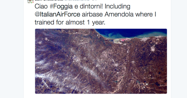 E’ mezzogiorno sulla ISS (Orario UTC), sono le 13:00 in Italia. Samantha Cristoforetti, prima donna italiana nello spazio, sorvola i cieli della capitanata. Poche Righe, due foto. La Cristoforetti, che prestò servizio anche a Foggia, saluta così il 32° stormo dell’Aeronautica Militare (Amendola) dove si è addestrata per circa un anno durante la sua straordinaria carriera. La Stazione Spaziale Internazionale viaggia ad una velocità di 27,724 km/h circa completando in un giorno quasi 16 orbite del pianeta. Sedici scatti a disposizione dunque per fotografare lo stivale, sempre se le perturbazioni lo consentono.