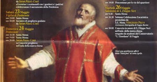 «Per il secondo anno – commenta il parroco Don Antonio Sacco – siamo riusciti, con l’aiuto dei nostri parrocchiani, ad organizzare un evento di preghiera e di festa in onore di San Filippo Neri. Ad accompagnarci sarà lo spirito di forte entusiasmo della nostra Comunità, che da troppi anni ormai attende il completamento delle strutture parrocchiali all’interno di un contesto dove la “Parrocchia” assolve non solo la primaria funzione di punto di riferimento ecclesiale, ma anche quella di riferimento sociale all’interno di un quartiere dove, purtroppo, non esistono luoghi di aggregazione nonostante questa zona esista ormai da 15 anni circa»