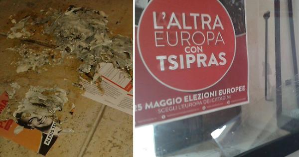 «Solo pochi giorni fa era pervenuta una lettera minatoria al comitato elettorale “L’Altra Europa con Tsipras” e ieri notte, presumibilmente attorno alle 3,30, alle minacce sono seguiti i fatti: una o più persone hanno sfondato una vetrina della sede e hanno tentato di dare fuoco al materiale custodito nella sede. Probabilmente disturbati dal passaggio di persone non sono riusciti nel loro intento teppistico», fa sapere Giorgio Cislaghi segretario del circolo CheGuevara di Foggia.