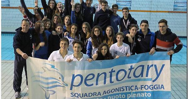 Dopo la doppietta nel 2010 e nel 2011, e due stagioni di assenza, la squadra del nuoto pinnato della Pentotary Foggia torna nelle vasche di Caserta per il campionato italiano di specialità. E il ritorno per il club di viale Pinto è di quelli da urlo: i nuotatori foggiani, infatti, riprendono lì dove avevano lasciato, conquistando il tricolore, il terzo in bacheca per il team del presidente Ciavarella. Tra gli atleti della società del delfino spiccano i tre ori (due individuali ed uno di staffetta) di Ludovica Ciavarella, classe 1999, l’oro, un argento ed un bronzo (in staffetta) di Denise Perna, due ori di Francesca Sicilia (uno in staffetta), due ori (uno in staffetta) ed un bronzo di Rita Maria Pignatiello, un oro ed un bronzo in staffetta per Domenico Panunzio, un oro (in staffetta) un argento ed un bronzo per Roberta Mallardo, un oro (in staffetta), ed un bronzo per Martina Giuliani. Due Argenti, di cui uno in staffetta, per Fabrizio Doto ed un argento ed un bronzo per Emanuele Morganella. Un oro in staffetta ed un bronzo in gara singola per Giorgia Frasca, atleta che da solo un anno ha intrapreso la “carriera” agonistica con ottimi risultati. Vincono un oro in staffetta Soraya Abbruzzese e Claudia Nesso, l’argento Francesco Sepalone e Giovanni de Vito, il bronzo Giulio Ciavarella, Giuseppe Cannata, Alessandro Capuzzolo, Giorgia Molinaro e Francesca Faranna.
