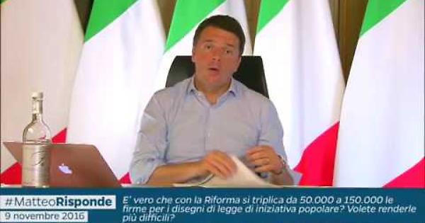 Come potete rendervi conto dal suo video, dice che «con la riforma costituzionale, se per il referendum sulle trivelle si fossero raccolte 800 mila firme, il quorum si sarebbe abbassato e il referendum sarebbe passato». Gli fa notare l'avvocato Enzo Di Salvatore, docente di diritto costituzionale: «Qualcuno può far sapere al nostro Presidente del Consiglio che la nuova disposizione sulle 800 mila firme non si applica nell'ipotesi in cui il referendum abrogativo sia richiesto dalla Regioni - com'è stato, appunto, per il referendum del 17 aprile - in quanto non ci sarebbero firme da raccogliere?»