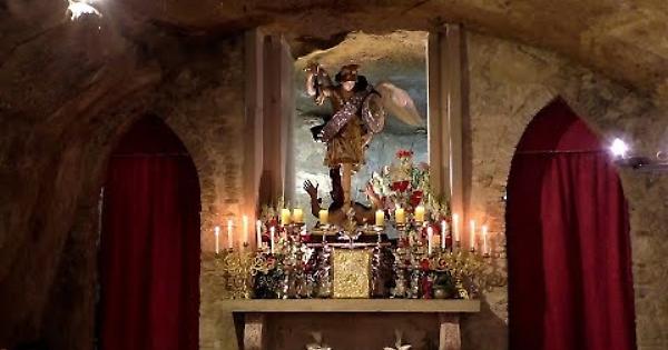 Secondo la leggenda, l’Arcangelo entrò nella grotta seguito da un grosso toro che restò incastrato nella roccia. Quando il padrone del toro riuscì a liberarlo, questi rimase abbagliato dalla fonte di luce dell’Arcangelo. Subito dopo l’accaduto, l’uomo raccontò la vicenda ai compaesani che si recarono alla grotta, trovando San Michele, assetato, genuflesso e con le mani posate a terra nel punto dove miracolosamente affiorò una sorgente d’acqua. Rivolto a sud, l’ingresso della grotta è tamponato da un muro su cui si apre la porta di accesso. All’esterno, si trovano un pozzo e un campanile a vela, in un piccolo giardino, mentre all’interno trionfa l’altare maggiore con la statua dell’Arcangelo e gli altari minori, decorati da meravigliosi affreschi.