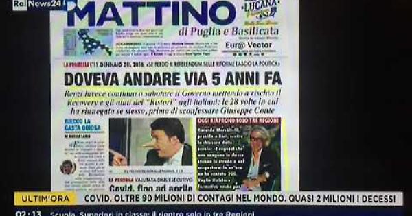 A quella promessa ne sono seguite altre 27 in cui Renzi ha rinnegato se stesso, prima ancora di sconfessare Conte. Così apriamo la nostra prima pagina di oggi, 11 gennaio 20211, a cui Pierfrancesco Pensosi dedica la sua attenzione nella rassegna stampa di RaiNews24, su Rainews